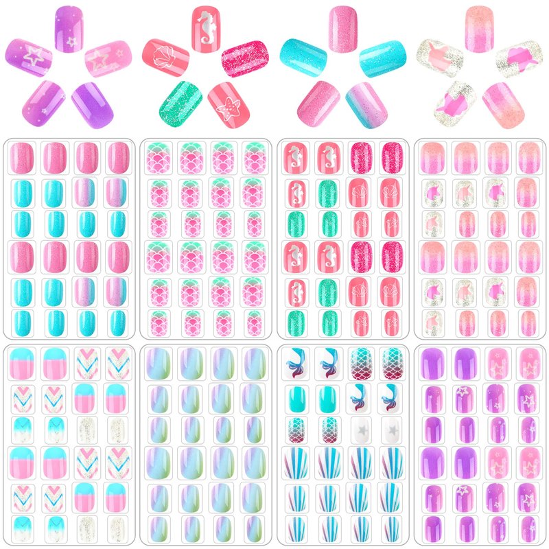 Package includes: 8 styles of fake stick on nails for kids with different colors Color: Gradient Style: Cute, fresh, romantic Size: 12 different sizes Tips for removal - Place the nails in warm water for 2 minutes to remove false nails more easily. Do not remove it suddenly, otherwise it may leave some marks on the nail surface. In this case, you can also wash the residue with water.Recommended Age Grading over 3 years old.