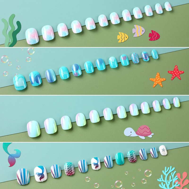 - BLUE THEME - Press on false nails are printed with fish tails, fish scales, butterflies, gradient colors, love and other patterns, full of fresh breath. Come and let your children experience the joy of nail art!