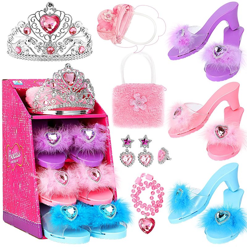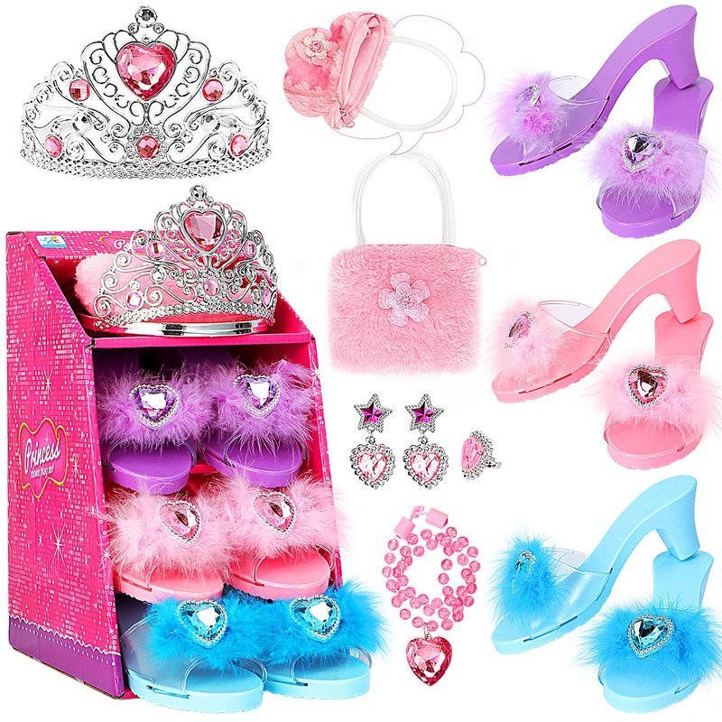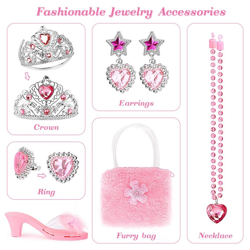 - PRINCESS DREAM: Every girl has a princess dream. Our princess dress up shoe set can easily help your girl fulfill her wish and steal the limelight with charming and durable pretend fashion jewelry accessories. High heels and jewelry combined to make the dress up game more fun, allowing girls to let their imagination and creativity run wild and enjoy role-playing.