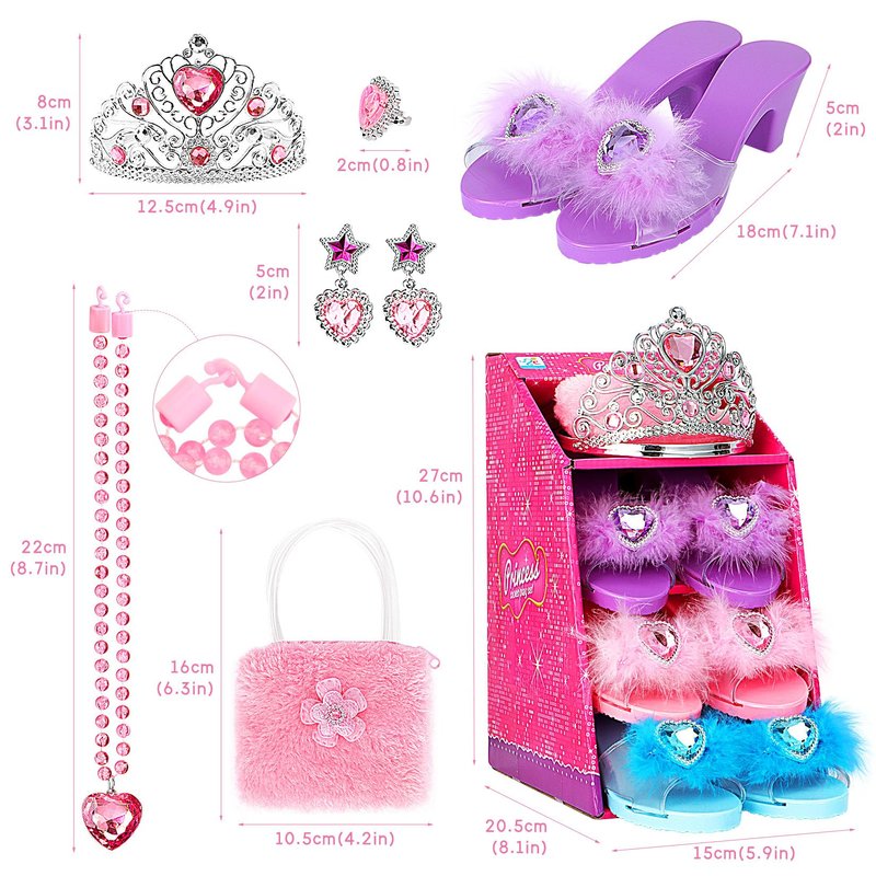 - PRINCESS SHOES SET: You will get 3 Pairs different color stylish heel shoes, 1princess crowns, 1 pairs of earrings, 1 necklaces, 1 ring and 1 pink handbag. All packaged in a cute pink storage box.