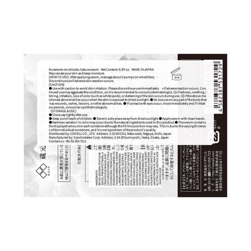 Kuramoto no Shizuku Sakura Yeast Serum contains Sake Lees Extract from the traditional Miyakotsuru Shuzo brewery in Kyoto. In addition to the ingredient, Kuramoto no Shizuku Sakura Yeast Serum contains Sake Lees Extract derived from Ishikawa Kenrokuen-Yaezakura yeast. Ishikawa Kenrokuen-Yaezakura yeast helps produce Type XVII collagen that composes basement membrane, keeps skin cell younger, helps new skin cells rise to the surface faster and leads to radiant skin. Ishikawa Kenrokuen-Yaezakura yeast with superior fermentation is rich in beauty ingredients like Vitamin B and Amino Acid and encourages skin cell turnover.