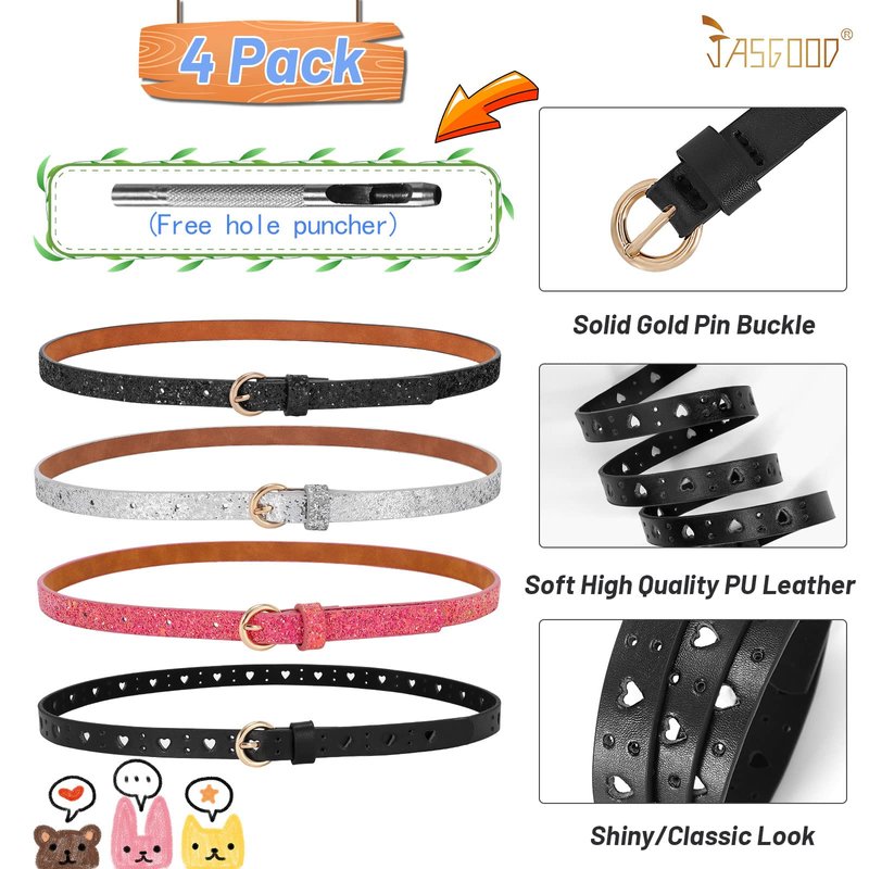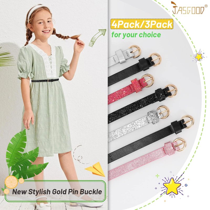 JASGOOD 4 Pack 3 Pack Kids Skinny Belts Glitter PU Leather Belts for Teen Girls Colorful Girls Waistbands for Jeans Dress