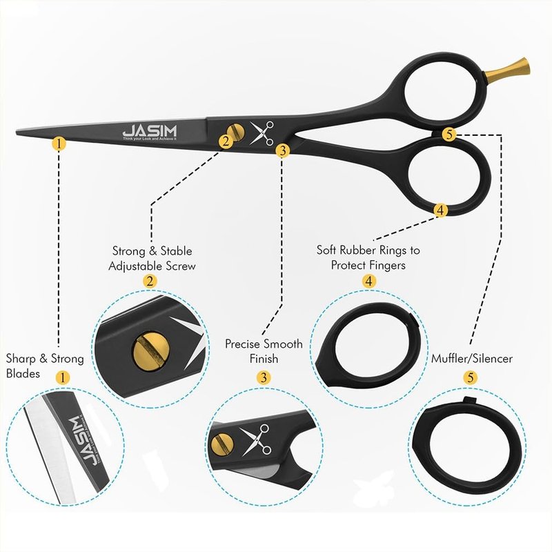 - Superior and Premium Quality material: JaSiM Barber Scissors having sharp edge blades with stunning appearance provide you a good experience for long term. Resilient professional hair scissors are made of 100% premium stainless-steel material