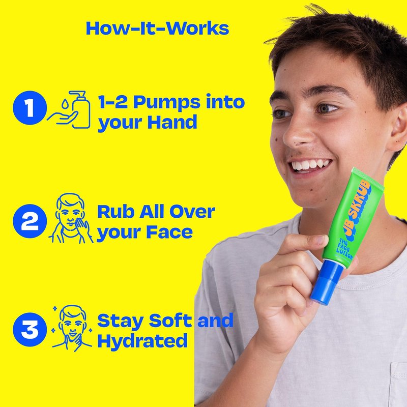 Unlock youthful radiance with JB SKRUB Face Lotion, crafted specifically for the unique needs of kids, tweens, and teens. Our face moisturizer provides essential hydration while balancing and protecting young, changing skin. Perfect for Young Skin: Tailored for kids aged 8β9 and teens aged 10β12, this non-comedogenic face moisturizer is ideal for daily use. It keeps skin hydrated by preventing dryness and controlling oiliness without clogging pores. Hydration Hero: Infused with Aloe Vera, Chia Seed, and Willowherb, our daily face moisturizer deeply hydrates and regulates oil production. It suits both dry and oily skin, making it a versatile addition to any skincare regimen. Acne Prevention: Specifically formulated as a face moisturizer for acne-prone skin, it soothes and calms while maintaining the skin's natural barrier. This ensures clear, vibrant skin, which is essential for teen skincare routines. Digital Defense: Protect against blue light with Chlorella vulgaris. Our advanced formula shields against digital stress, ensuring resilient and youthful skin. Lightweight Luxury: Experience the fast-absorbing, feather-light texture of our gel-lotion hybrid. It leaves no greasy residue, making it the perfect choice for oily skin and providing a smooth, matte finish. Fragrance-Free Comfort: Enjoy the simplicity of our fragrance-free formula, which is suitable for sensitive skin. It delivers unmatched hydration without irritating scents, allowing your natural confidence to shine. Teen and Tween Skincare Essential: Vital in any tween or teen skincare routine, this daily face moisturizer keeps skin soft, hydrated, and healthy, promoting a clear and confident complexion. Discover JB SKRUB's boys Face Lotion, your solution for balanced, hydrated, and radiant skin. Perfect for all young skin types, itβs the ultimate choice in skin care for teens 10-12 who prioritize clear, healthy skin.