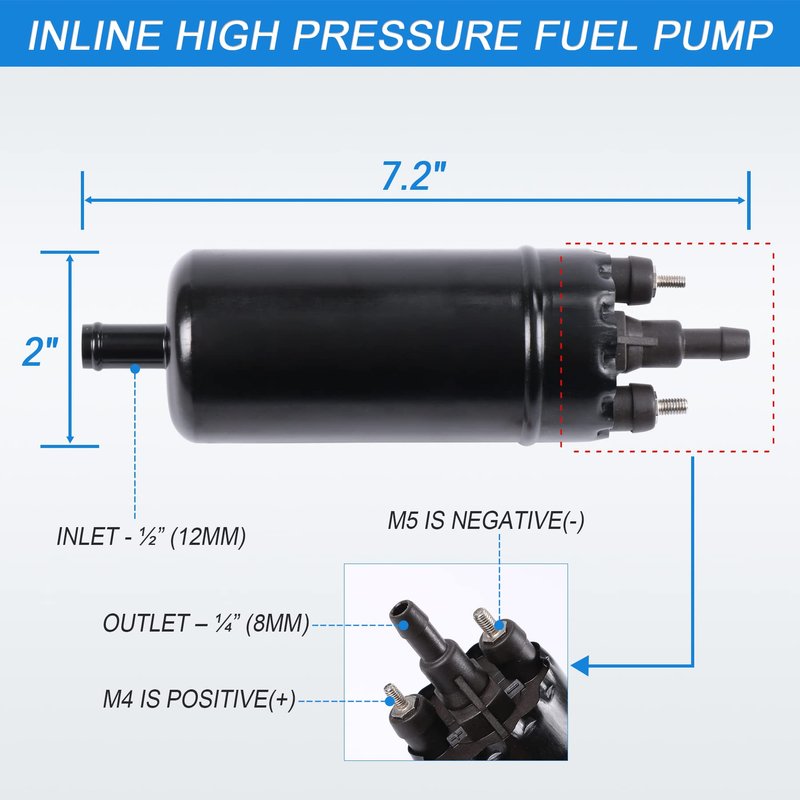 - Universal external in line fuel pump. Does not need to be mounted inside the tank; Use this pump for turbo/non turbo gas fuel injection systems up to 250bhp