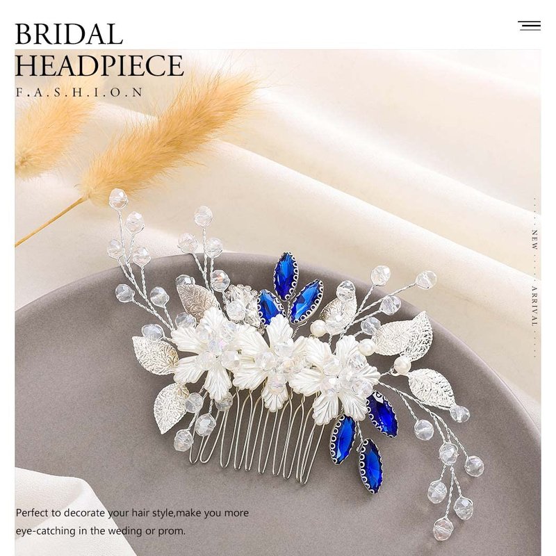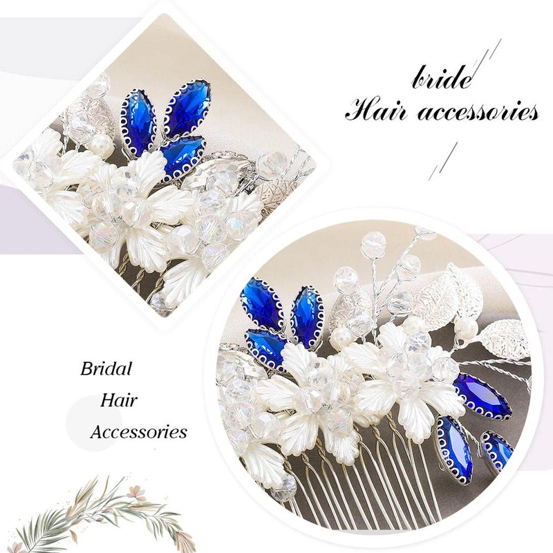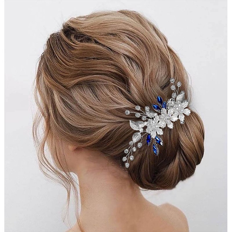 - Rhinestone hair comb is made of alloy,blue rhinestones,flowers and leaf.Elegant desigen enjoys unique appearance.
