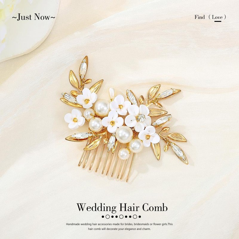 Jeairts Flower Wedding Hair Comb Glod Pearl Hair Pieces Leaf Headpiece Bridal Hair Accessories for Women