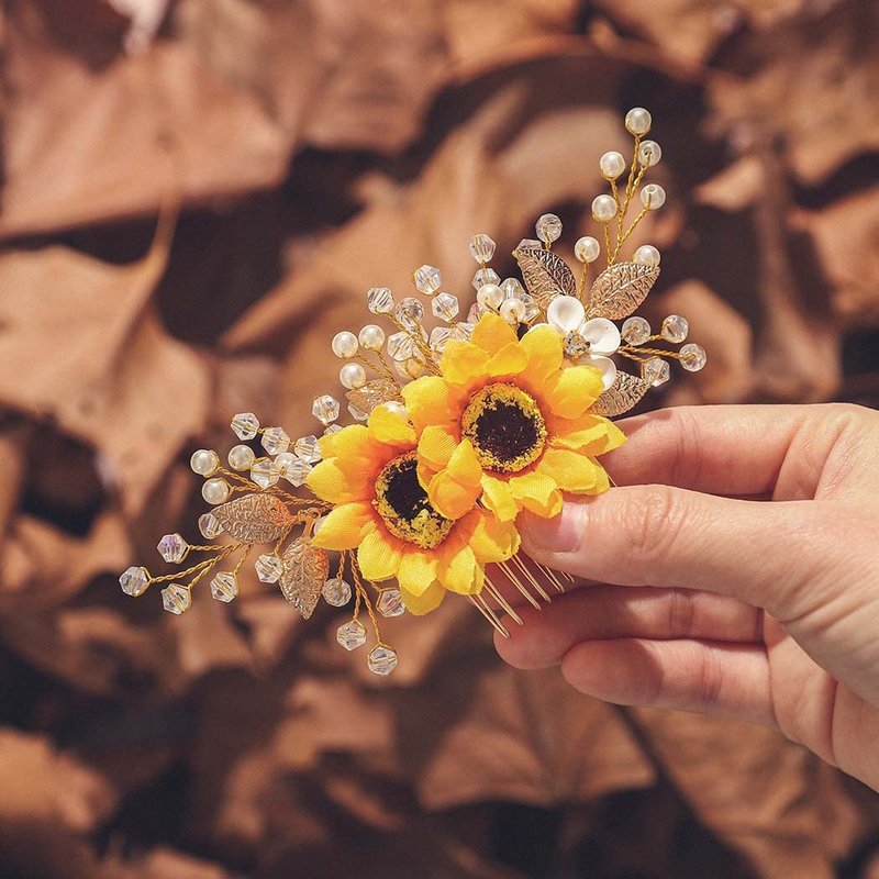 - Sunflower hair comb is made of alloy,sun-flowers,pearls,crystals and leaves.Colors:Silver.Simple yet elegant to decorate any updo on wedding day.