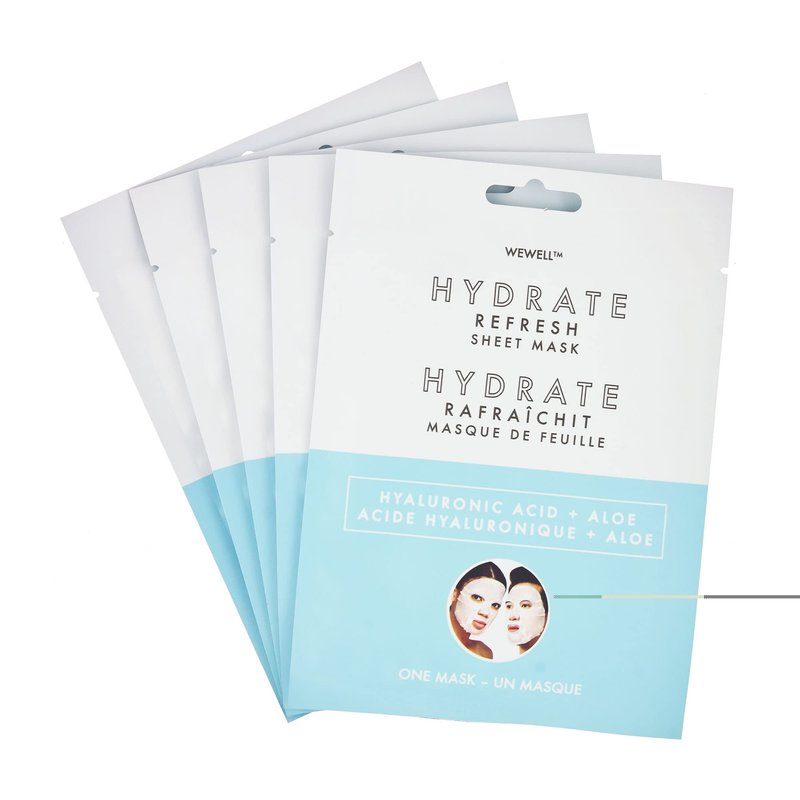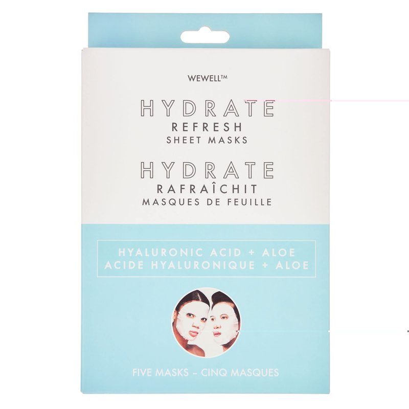 - WEWELL Hydrate Refresh Sheet Masks (5 masks) - Hyaluronic Acid + Aloe - Energize your skin with a hydrating and restoring sheet mask! This mask evenly covers the contours of the face infusing hyaluronic acid and aloe deep within the surface of the skin. The combination of ingredients energizes, brightens and hydrates the skin, leaving behind a moisturized and rejuvenated complexion.
