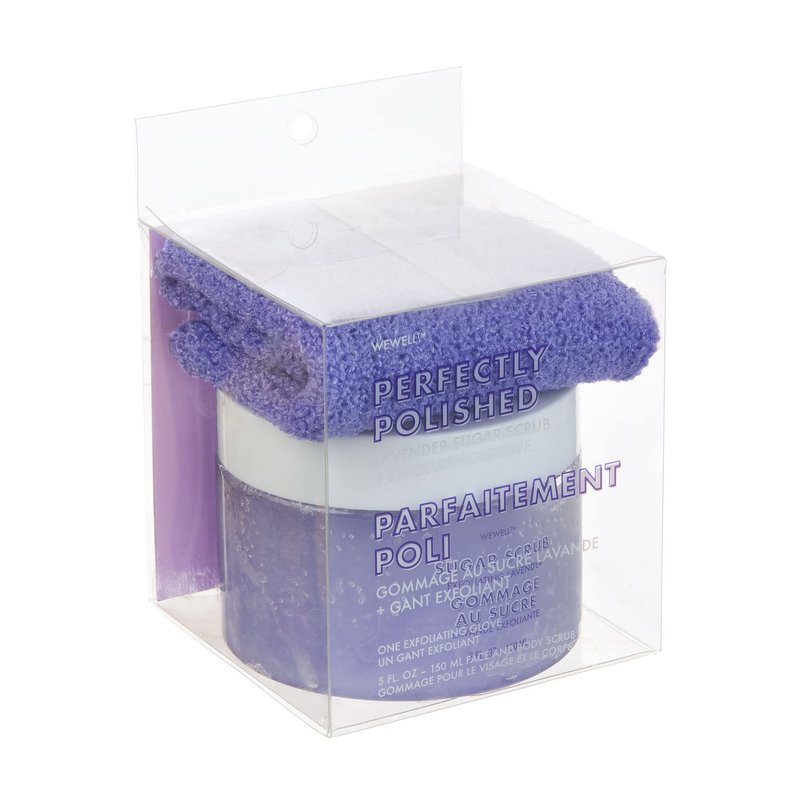 A unique lavender spa and beauty kit or gift for a special woman. A great gift for Christmas, Valentine's Day, Birthday and Mother's Day. The Skip the Spa kit includes a deep conditioning treatment for the feet that restores and nourishes dry, cracked and dehydrated skin. The masks evenly cover the feet infusing soothing lavender and chamomile deep within the skin. The masks help in calming skin irritation and redness and provide relief with discomfort. WeWell perfectly polished lavender sugar scrub and glove for exfoliating and cleaning the skin. Individual make-up removing and cleansing wipes. Great for travelling and vacationing.
