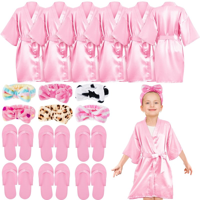 Jecery 18 Pcs Spa Party Supplies for Girls 6 Satin Kimono Robe 6 Spa Headband 6 Disposable Foam Pedicure Slippers (Pink,Size 6)