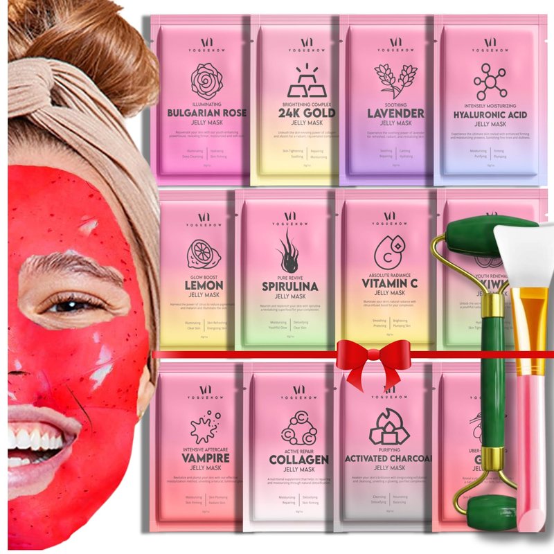 Jelly Mask for Facials - 12 Flavors Hydrating & Brightening Jelly Face Masks | Free Jade Roller & Spatula |Bulgarian Rose Lavender Hyaluronic Acid 24K Gold | Womens Christmas Gifts, Gift set for Women