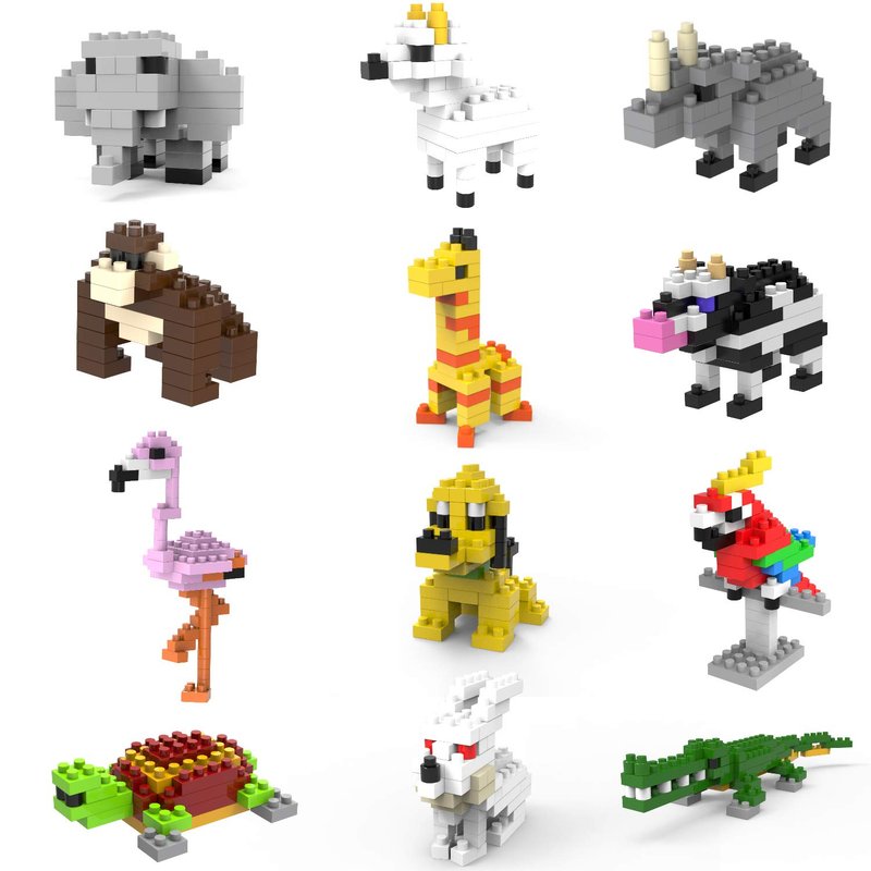 - ❤ 12 in 1 Building Animals Set- This item include 12 animals mini blocks pack ,Cow, flamingo, giraffe, orangutan, rhino, dog, parrot, crocodile, sheep, turtle, elephant, rabbit,each around 50 pieces set, your kids can learn different animals by set up by themself. suitable for kids ages 3 +.