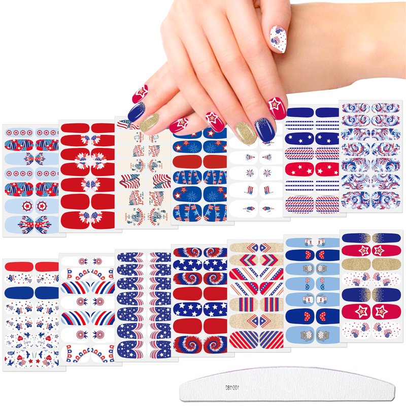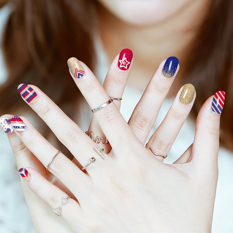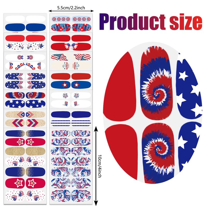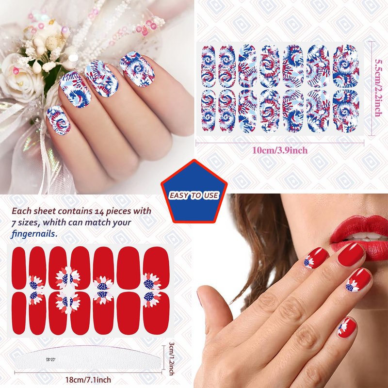 - 【Easy to Use】:These colorful Independence Day nail wraps are self-adhesive and easy to use, just choose the patterns you like and paste them on your nails, then apply a layer of nail polish to fix them, you can also match them with a colored base coat or combine different patterns together.