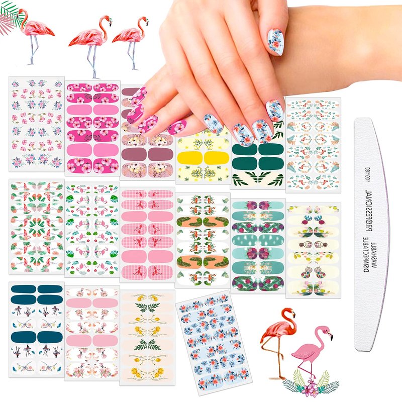 - 🌺🦩【PACKAGE CONTENTS】:Comes with 16 sheets colorful full nail stickers in different patterns and sizes, each sheet contains 14 pieces, totally 224 pieces, sufficient to meet your DIY nail art decoration needs, comes with 1 piece moon shape nail file, can bring much convenience to the DIY process.
