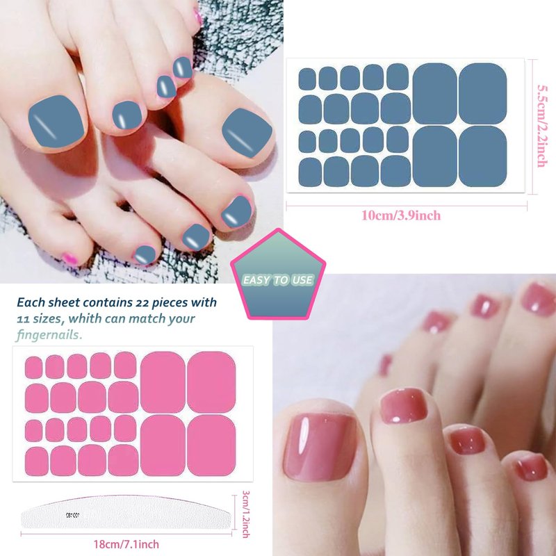 - 【Package Contents】:20 sheets mixed color self-adhesive toe nail wraps + 1pc moon shape nail file. 22 pieces for each sheet, 440 pieces in total.