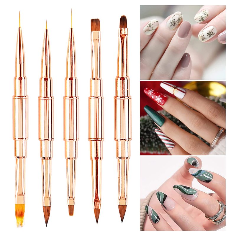 JERCLITY 5pcs Rose Gold Alloy Double-Ended Nail Art Brushes Set Nail Lace Brushes Round Flat Gel Builder Brush Nail Carving Pen Nail Liner Brush 3D Painting Brush Nail Design Tools for Acrylic Nails