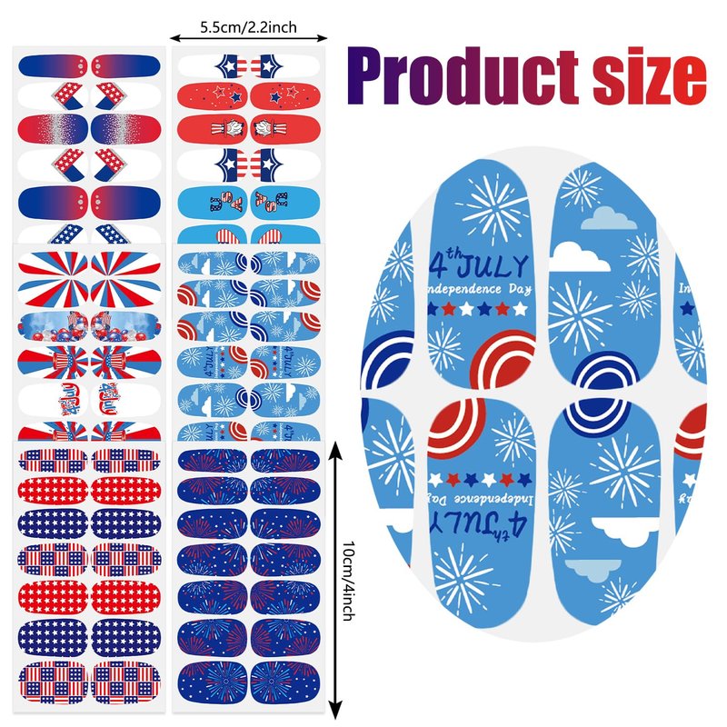 • 【Easy to Use】:These colorful Independence Day nail wraps are self-adhesive and easy to use, just choose the patterns you like and paste them on your nails, then apply a layer of nail polish to fix them, you can also match them with a colored base coat or combine different patterns together.