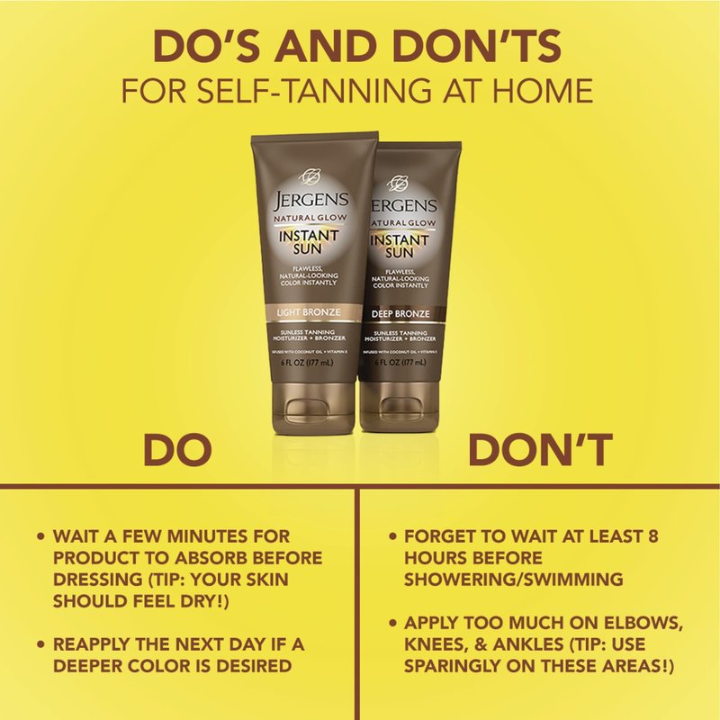 - SELF TANNER SET - This self tanner set includes one (1) 6oz Jergens Natural Glow Instant Sun Self Tanner Lotion + Bronzer in Deep Bronze and one (1) Jergens Natural Glow Reusable Tanning Mitt