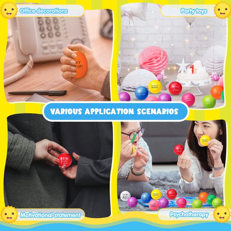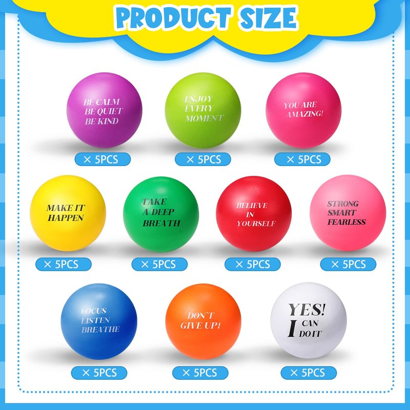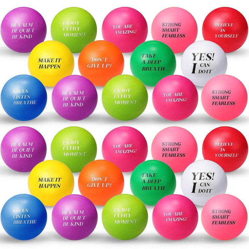 - Balls for Relaxation: these stress relief balls are ideal options for you to relieve your stress, anxiety or anger, making you to spend a peace and relaxing time, keep a peaceful mind; They are printed with inspirational quotes on each ball to encourage you to calm down and cheer you up