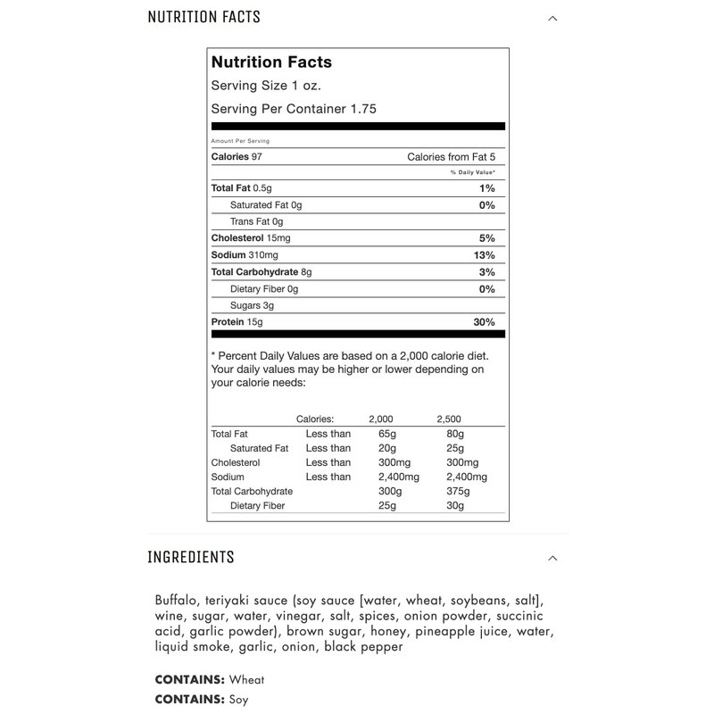 - Includes 3 - 1.75 oz. bags of All-Natural Teriyaki Buffalo Jerky