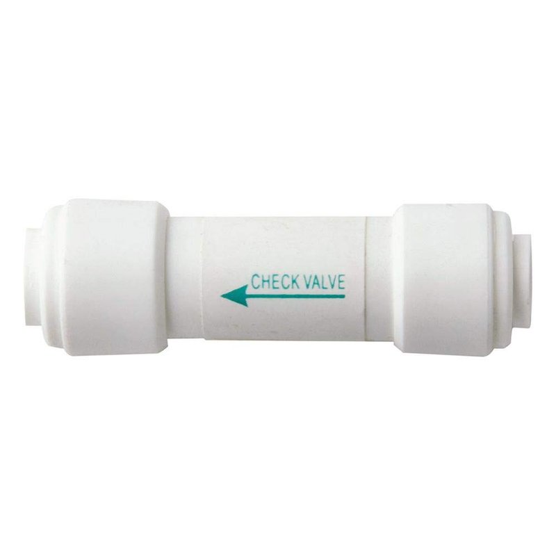 1/4" push to connect inline check valve. Install after the RO permeate port to prevent damage to the RO membrane from back pressure or in any 1/4" water line where elimination of backflow is desired. Manufactured by injection molding, using food grade virgin polypropylene, the valve is extremely durable and will provide years of leak free performance. We have used this check valve in our reverse osmosis units and water filtration systems and found them to be very reliable. The valve is lightweight, easy to install, and has a directional arrow to indicate direction of water flow.
