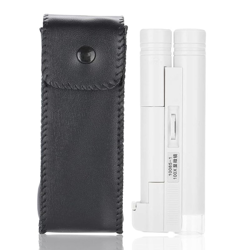 100x zoom LED microscope magnifying glass, enlarge the object to 100 times its original size. Suitable for jewelry and currency applications. It magnify the items nicely, which is great for examining the details. Mini size and lightweight, easy and convenient to use.