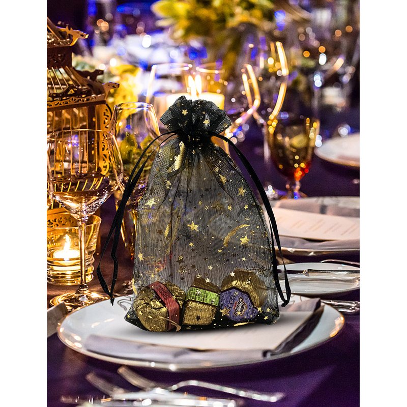100PCS Black Moon Star Organza Bag 5X7 inch is a very durable delicate fabric made of high quality mesh organza, which makes a perfect decorative feature.they are small and exquisite,convenient and beautiful for all your needs.
