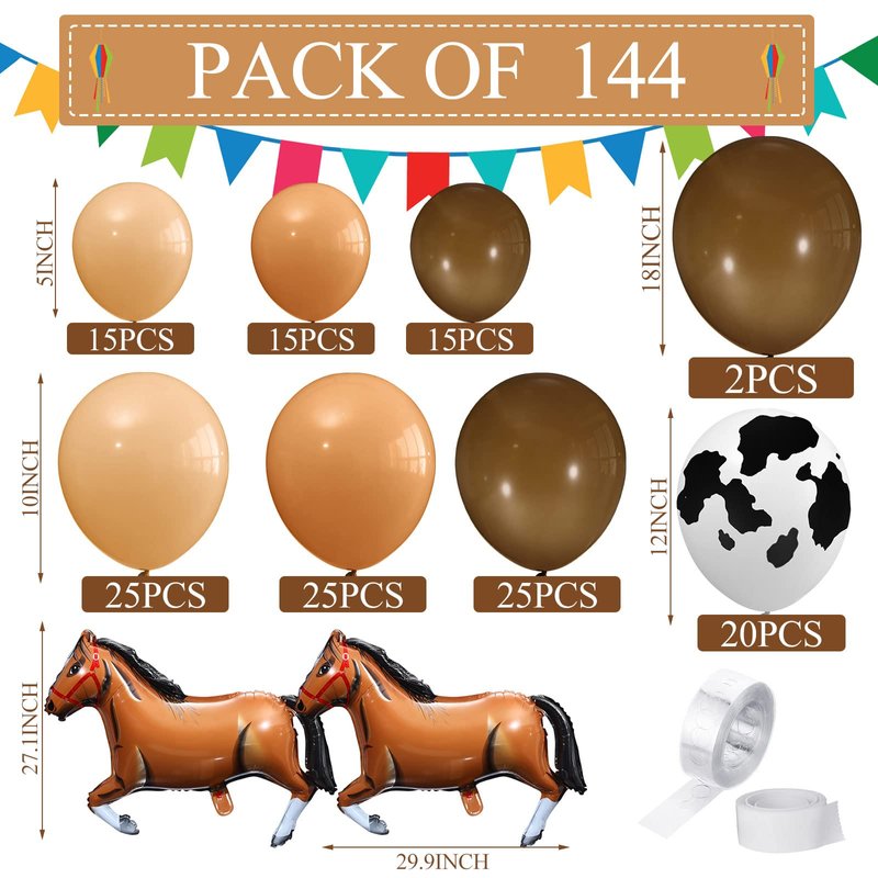 - Ideal Combination: you will get 146 cowboy birthday decorations, including 45 pcs 5 inch balloons, 75 pcs 10 inch balloons, 20 pcs 12 inch cow balloons, 2 pcs 18 inch brown balloons, 2 pcs 30 inch horse shaped balloons, a roll of balloon chain and a roll of glue point dots, ample quantities and complete sets to suit your decor and bring a rich farm vibe to your party