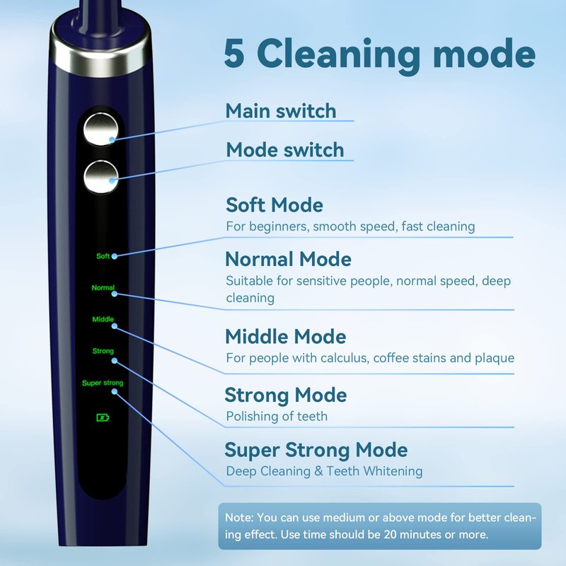 - 【5 cleaning modes】 Dental Calculus Plaque Remover has 5 modes, including soft, normal, middle, strong, super strong mode, corresponding to choose their own suitable mode to use, it is recommended to use medium or above mode for better cleaning effect. Use time should be 20 minutes or more. It can reduce the damage that manual dental tools may cause to your teeth and keep your teeth and gums healthy.