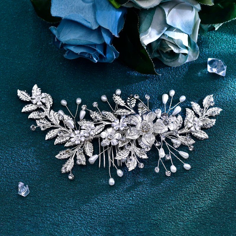 JHOO Crystal Leaf Bride Wedding Hair Comb Alloy Flower Hair Accessories Handmade Imitation Pearl Hair Accessories Suitable for Women's Party Hair Accessories HP683 (Sliver)
