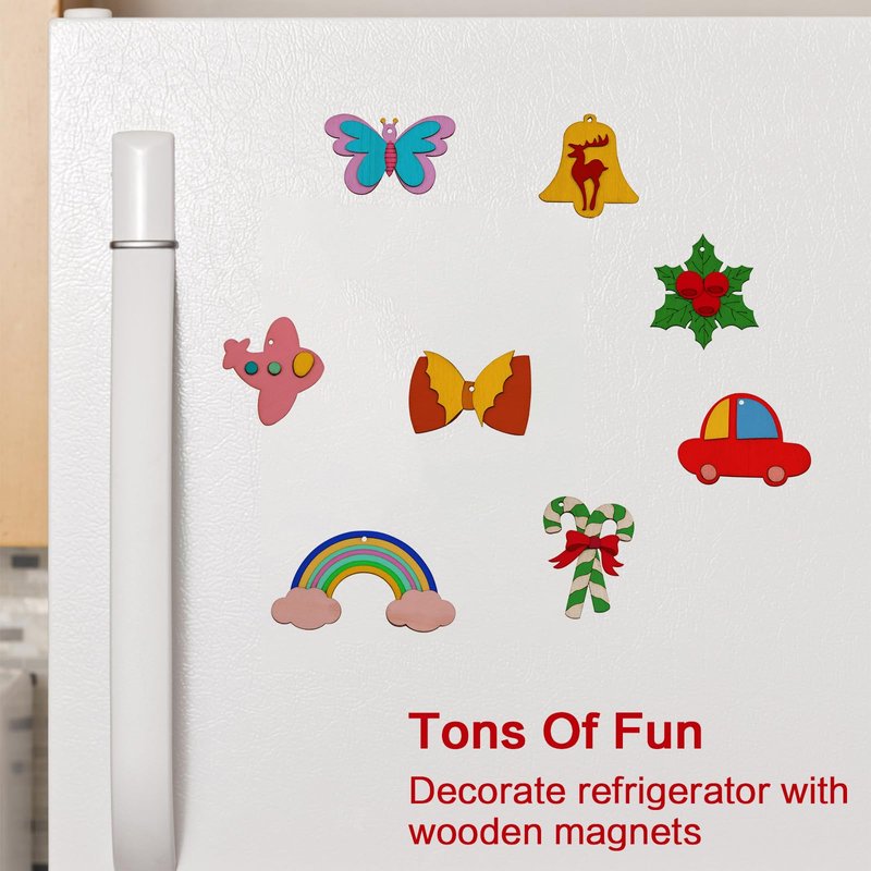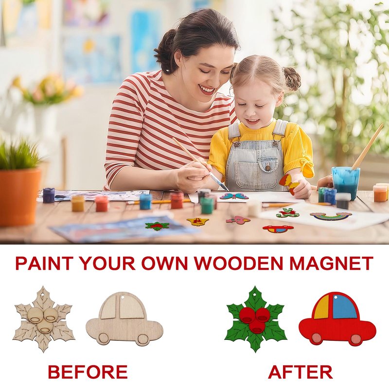 - Package: Includes 42 wooden Christmas crafts, 12 colored pens, magnet stickers.