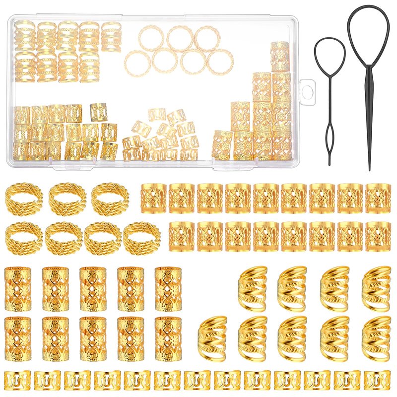- 【Package Contents】The package includes 110 pieces of dreadlocks jewelry and 2 pull hairpins, all stored in a transparent box for easy and quick access. Featuring five different high-end styles and a wide variety of designs, these hair accessories are perfect for any occasion and hair volume. The specially designed, shiny, classic, and beautiful gold dreadlocks jewelry are perfect for hair extensions and braids, making you stand out.