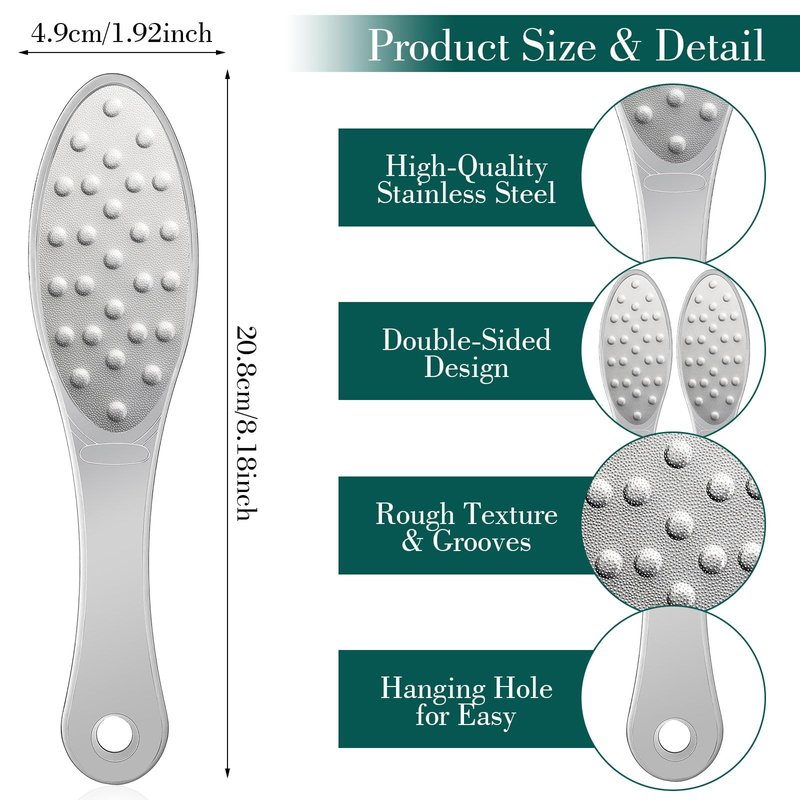 - 【Premium Stainless Steel Construction】Weighing 73g and crafted from 1.5mm thick stainless steel, this foot scraper for callus removal is sturdy yet lightweight. It resists fading and bending, ensuring durability without compromise. Stainless steel also shields against rust and corrosion, effectively buffing away dry skin and smoothing rough patches while being gentle on your feet to prevent pain or irritation.