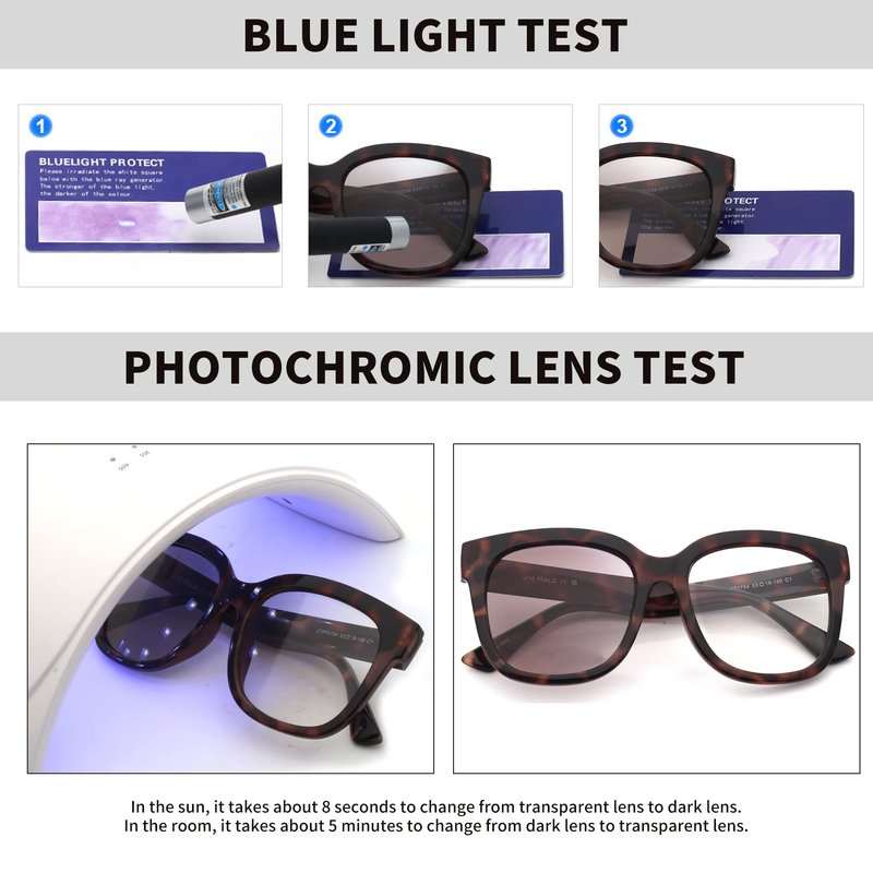 - Photochromic Design - The magical photochromic lenses are based on the intensity of sunlight and ultraviolet lights. Clear blue light lenses change into brown or grey.