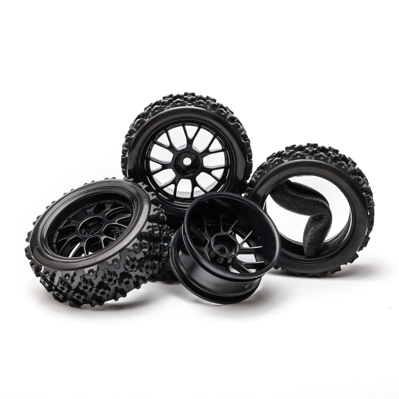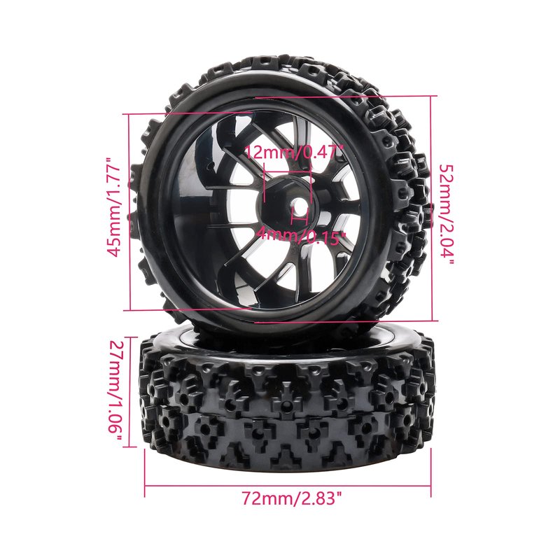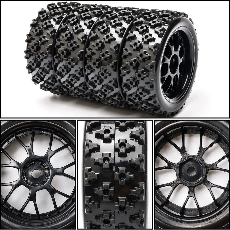 - Y-shaped black wheels with plum (cross-hole) soft leather 1/10 buggy tires give the rc car a unique and cool look. The black wheel design adds to the overall fashionable look, while the plum blossom pattern of the soft leather tyres adds a touch of sophistication and detail. Suitable for 1/10 road rc and rally cars, also suitable for 1/14 or 1/16 rc buggies