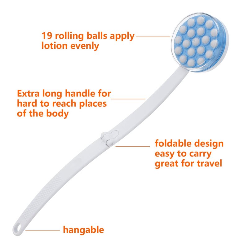 SELF LOTION APPLICATOR FOR BACK - Simply self apply lotions, sungreen, creams, gels on your back, especially for those hard to reach places without bending or twisting, no need anyone help LONG HANDLE - The handle of lotion applicator measures 18 inch length, makes it easy to apply lotion to areas that are hard to reach, such as back, leg, feet, great for elderly, arthritis and people live alone 19 ROTATING BALL - Just fill your favorite lotion and let the 19 rotating balls spread the lotion evenly and smoothly on your back, and massage muscles to help you relaxing at the same time FOLDABLE DESIGN - it will be convenient for you to carry when travel, fold to save space, easy to put it in your bag CLEAR COVER - Screw tightly to seal the applicator head, it will cover the rollers when not in use to keep clean, no mess, also keep lotion reservoir from dry out