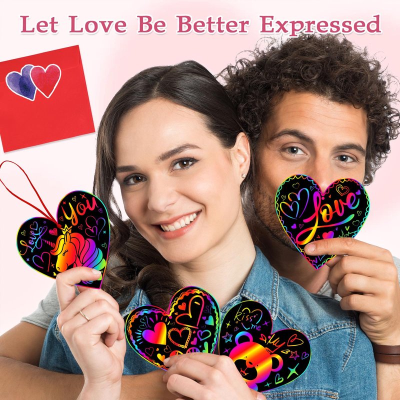 - Complete Valentine's Art Set-This Valentine's Scratch Art Kit includes everything you need for hours of creative fun! You’ll receive 44 heart-shaped scratch cards, 44 envelopes, 44 wooden styluses, 44 red strings and 50 Heart Stickers in an elegant gift box. Perfect for classroom activities, school prizes or Valentine’s Day crafts!