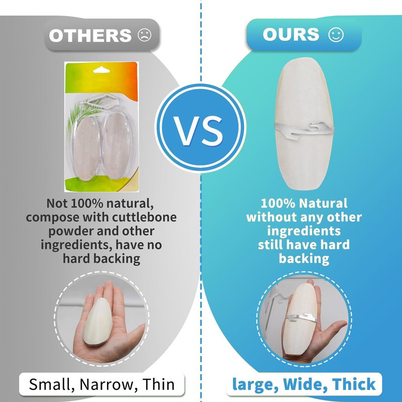 - 【Cuttlebone Function】:Cuttlebone is an important dietary supplement for birds because it is a great source of necessary minerals and calcium, which helps birds with bone formation and blood clotting. The texture of cuddle bones is relatively soft and easy to bite, the cuttlefish bones maybe easily damaged and broken. But please don't worry, any shreds are edible.
