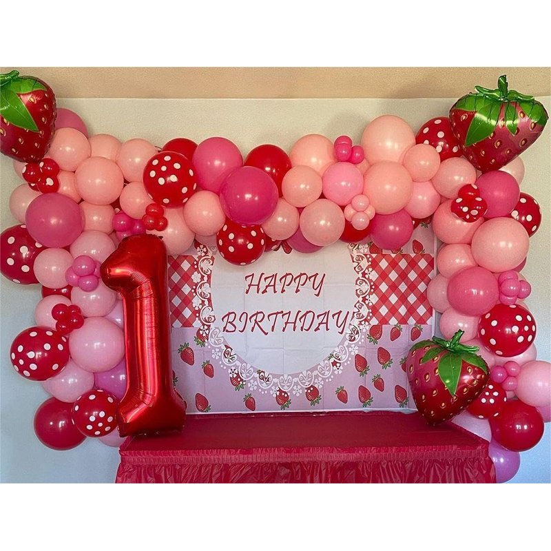 - VERSATILE STRAWBERRY SHORTCAKE PARTY DECORATIONS: This strawberry balloon arch is perfect for sweet one strawberry berry first birthday party, berry sweet strawberry baby shower decorations, strawberry party decorations, and more. Create a unique and stylish ambiance indoors or outdoors. Delight in Cherished Memories with our Strawberry Balloon Arch Kit.
