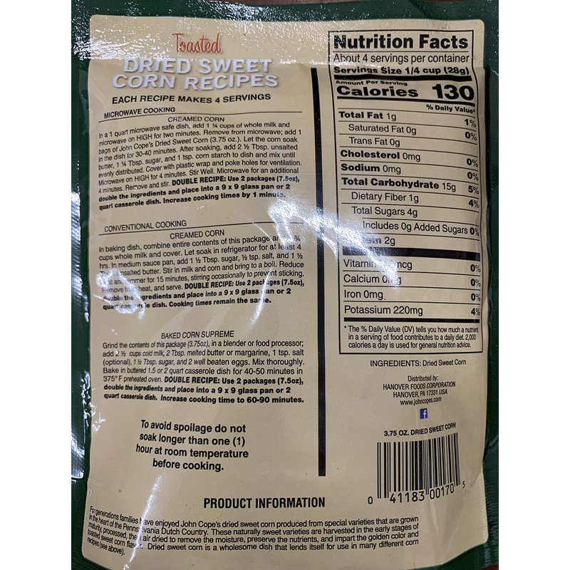 For generations, families have enjoyed John Copes dried sweet corn produced from special varieties that are grown in the heart of Pennsylvania Dutch Country. These naturally sweet varieties are harvested in the early stages of maturity, processed, then air dried to remove the moisture, preserve the nutrients and impart the golden color and toasted sweet corn flavor. Dried sweet corn is a wholesome dish that lends itself for use in many different corn recipes.