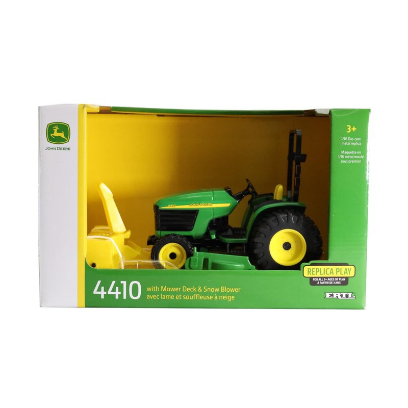 1/16 John Deere 4410 with Mower Deck and Snow Blower Toy - LP83254. Features mower deck and snow-blower attachments. Configured with MFWD front axle, single rear tires, open station with fenders, and ROPs bar. Age grade: 3+ 1/16 Die-Cast Metal replica. Made of some plastic parts. Measures approx.: 6.5" x 4.5" x 3.5" This is a Licensed John Deere Product.