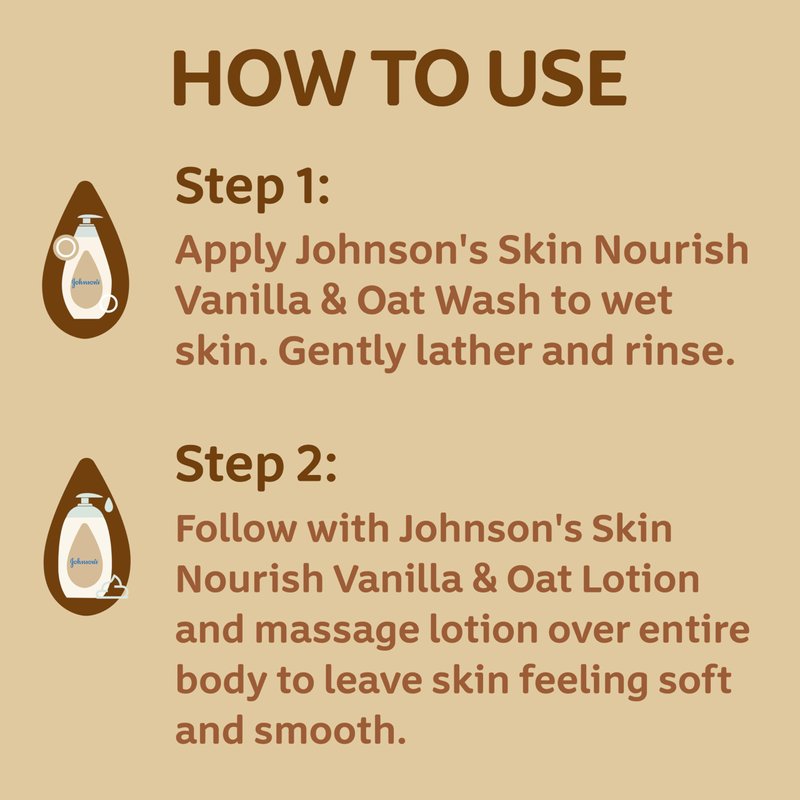 - 16.9-fluid ounces of Johnson's Skin Nourish Moisturizing Baby Body Lotion with vanilla and oat scents and moisturizers to soothe and relieve dry skin for all-day-long moisture