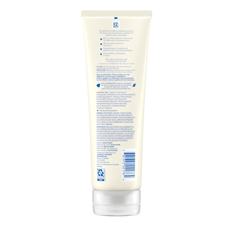 - The rich, creamy texture of this baby body oil moisturizes dry skin for 24 hours with a non-greasy feel. The moisturizing oil provides an extra boost of moisture compared to Johnson's Skin Nourishing Lotion