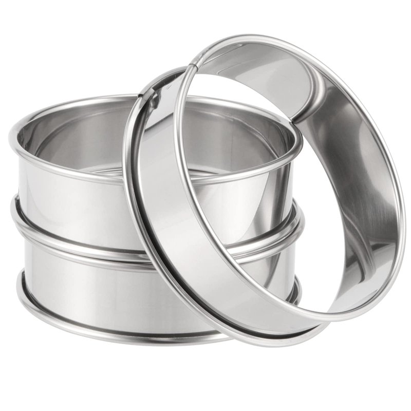 - WELL MADE - These 4 inches round tart rings are made of premium 304 stainless steel. These rings are nicely made with smooth seams and a solid rolled edge that makes it easy to use tongs to remove them once the muffins are flipped. The rings are solidly built, with no sharp edges.