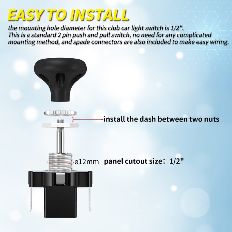 ★Easy to Install★ the mounting hole size for universal headlight switch is 1/2" and club car light switch has no need for any complicated mounting method. Spade crimp terminals are also included to make easy wiring.