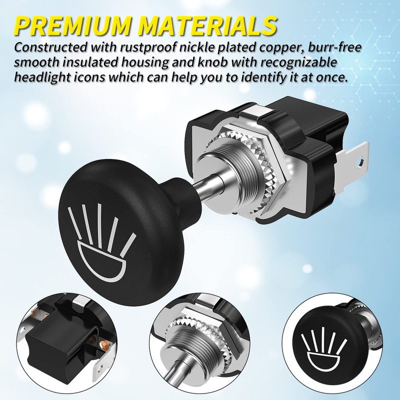 - ★Premium Materials★ Golf cart headlight switches are onstructed with rustproof nickle plated copper and burr-free smooth insulated housing and knob with recognizable headlight icons which can help you to identify it at once.