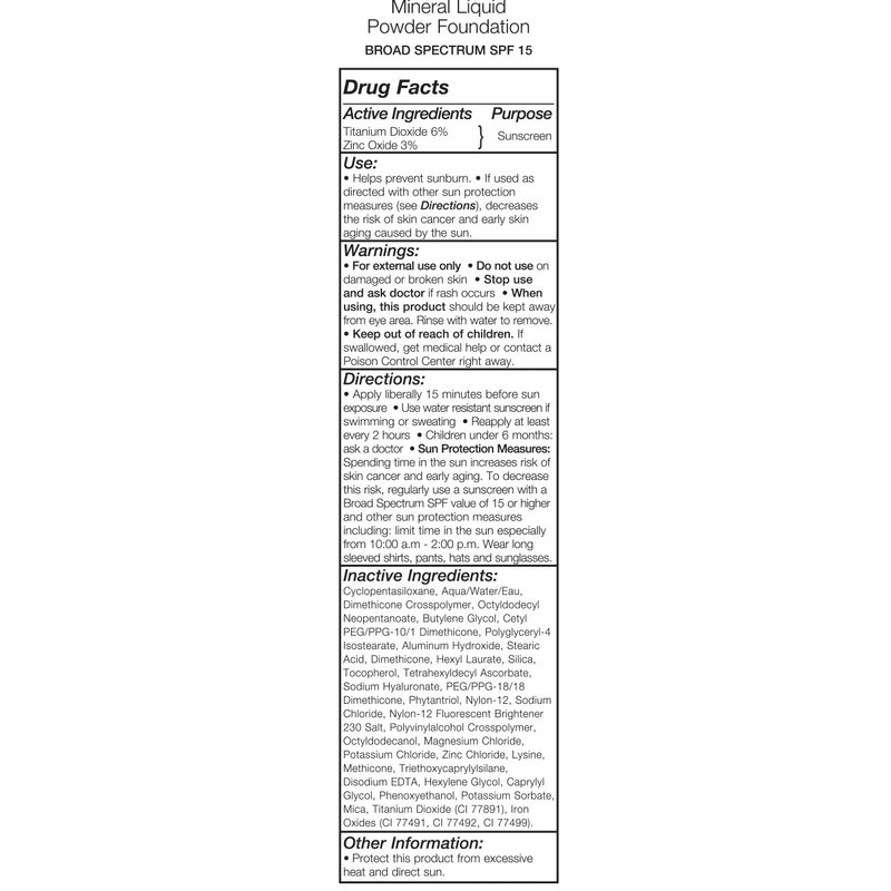 Treat your skin to a little therapy with this fabulously breathable, hypoallergenic, oil-free foundation that smooths over your skin in a creamy liquid form, setting to a feather-light powder finish. The result is amazing coverage that will enhance the natural beauty of your skin and last all day long. Mineral Liquid Powder Foundation SPF 15 is velvety smooth and technologically advanced formulation that glides on your skin with flawless coverage. This incredible makeup treats your skin to a delight of complexion enhancing vitamins and antioxidants contained in the rich, silky liquid version of the mineral-powder foundation. Containing Vitamin A for skin conditioning and antioxidants E and C to promote the natural beauty of your skin, the Mineral Liquid Powder Mineral Foundation SPF 15 provides natural UV protection and no harmful or irritating chemicals—perfect for sensitive skin! 1.2 oz (35 g)