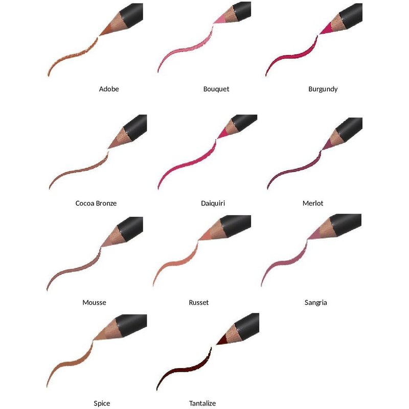 Draw the perfect lip outline with our super-smooth, creamy, lip defining formula. Soft pencils wont drag or pull on delicate lip line and are easy to sharpen to the perfect point. Laser-focus precision sharply defines with comfort. Highly pigmented color glides on smoothly to create shape, definition and various lip effects. Wooden sharpen-able pencil allows for clean, well-defined application. Helps keep lipstick in place and stops color from feathering. Color Reference; ADOBE; a rusty tan. BOUQUET; a dusty rose. COCOA BRONZE; a satin copper brown. MERLOT; a deep burgundy. MOUSSE; a light chocolate. RUSSET; a reddish brown. SPICE; a nude tan.
