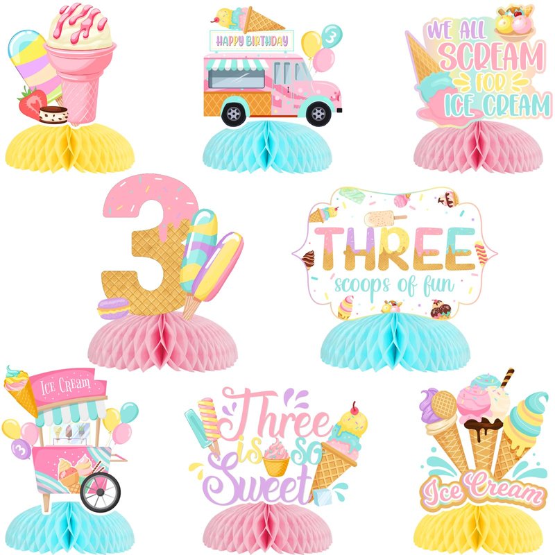 - Package Includes: You will receive 8 x ice cream honeycomb centerpieces, including 2 pieces 8-inch and 6 pieces 6-inch, these cute ice cream honeycomb centerpiece can help you hold and unforgettable ice cream theme 3rd birthday party